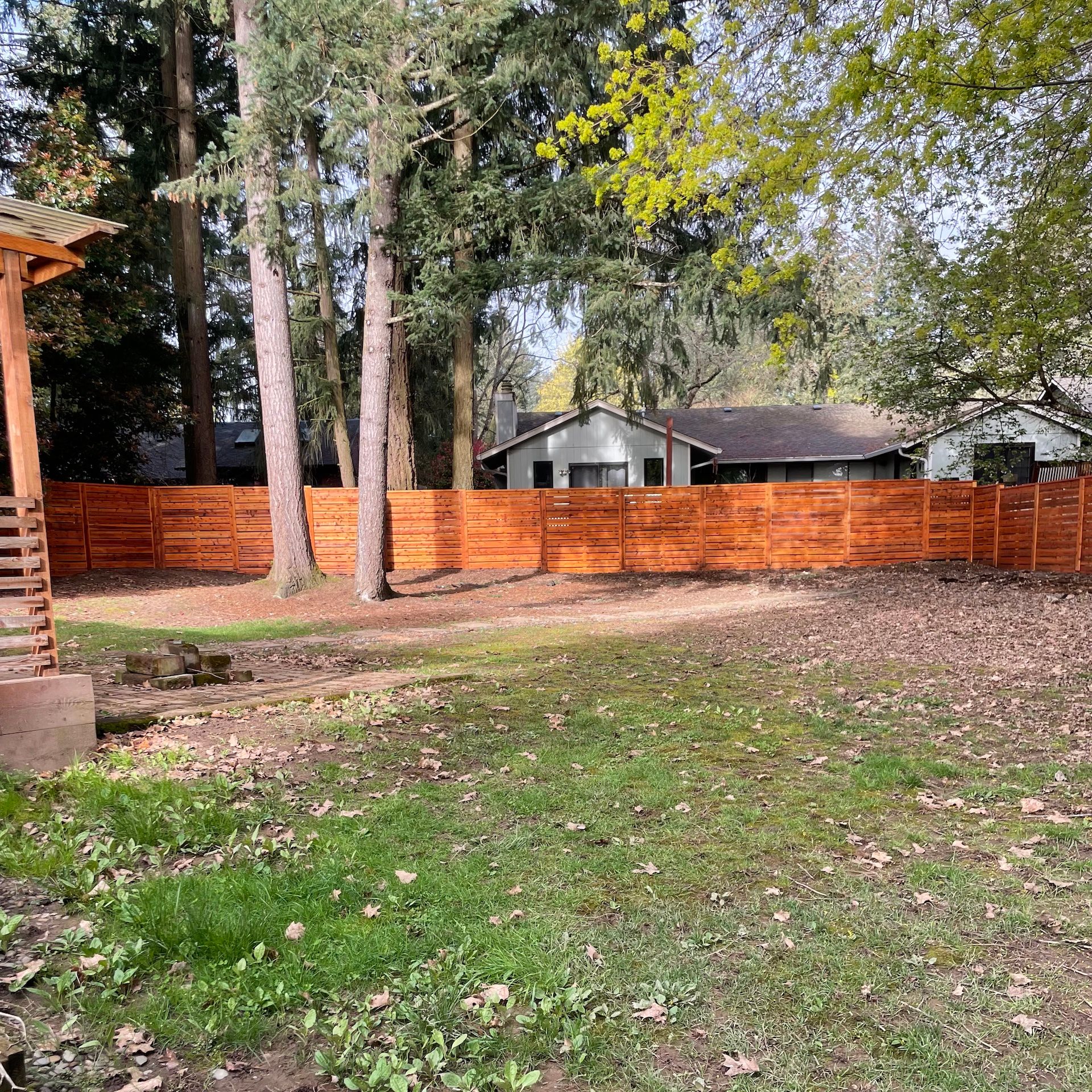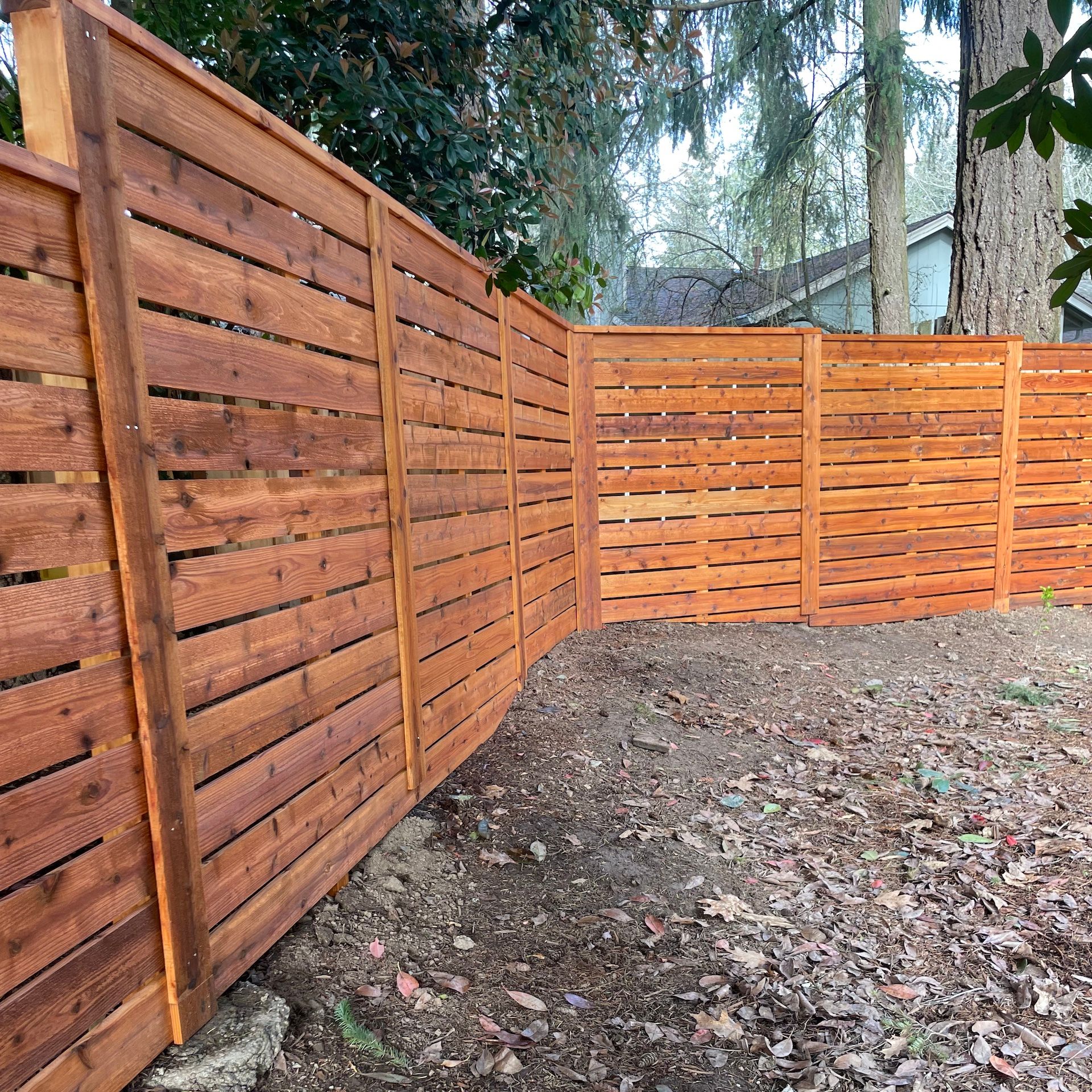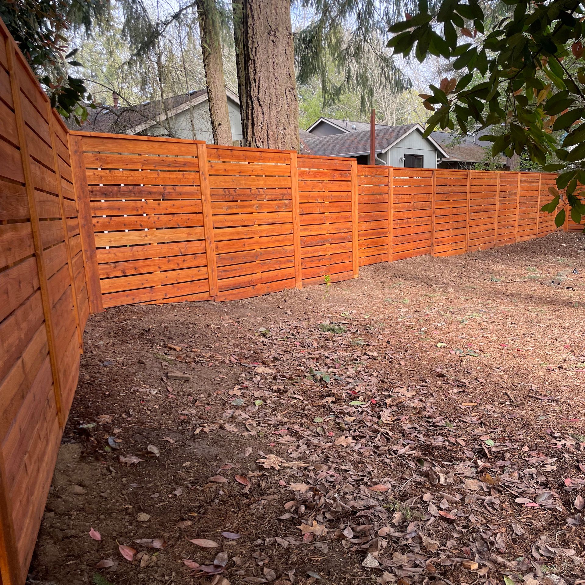 Give any backyard a new look with a wood board fence. This homeowner went with a medium orange stained wood fence to provide some style and privacy to the backyard. All our fencing material comes pre-treated to be weather resistant and can be stained to the color of your choice.