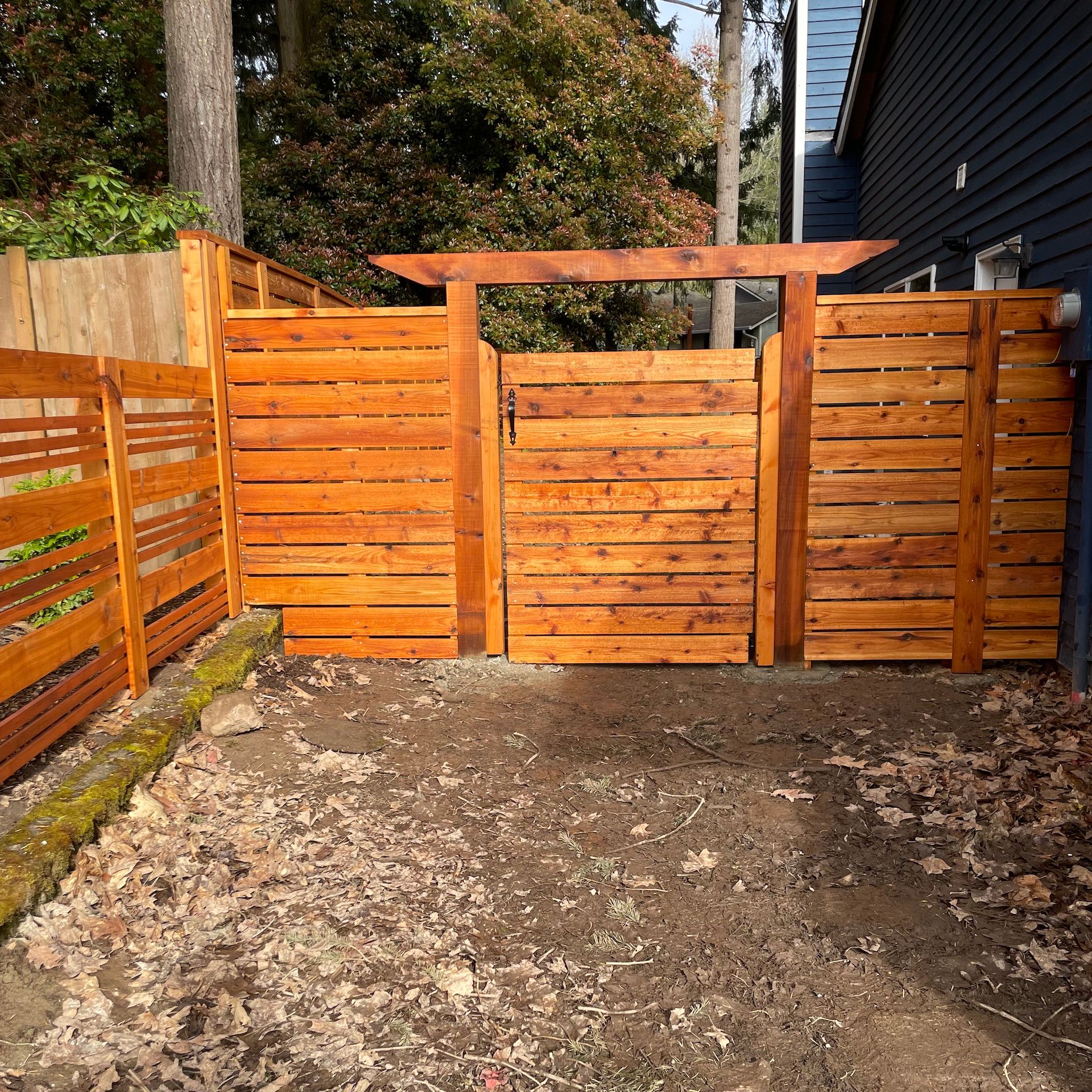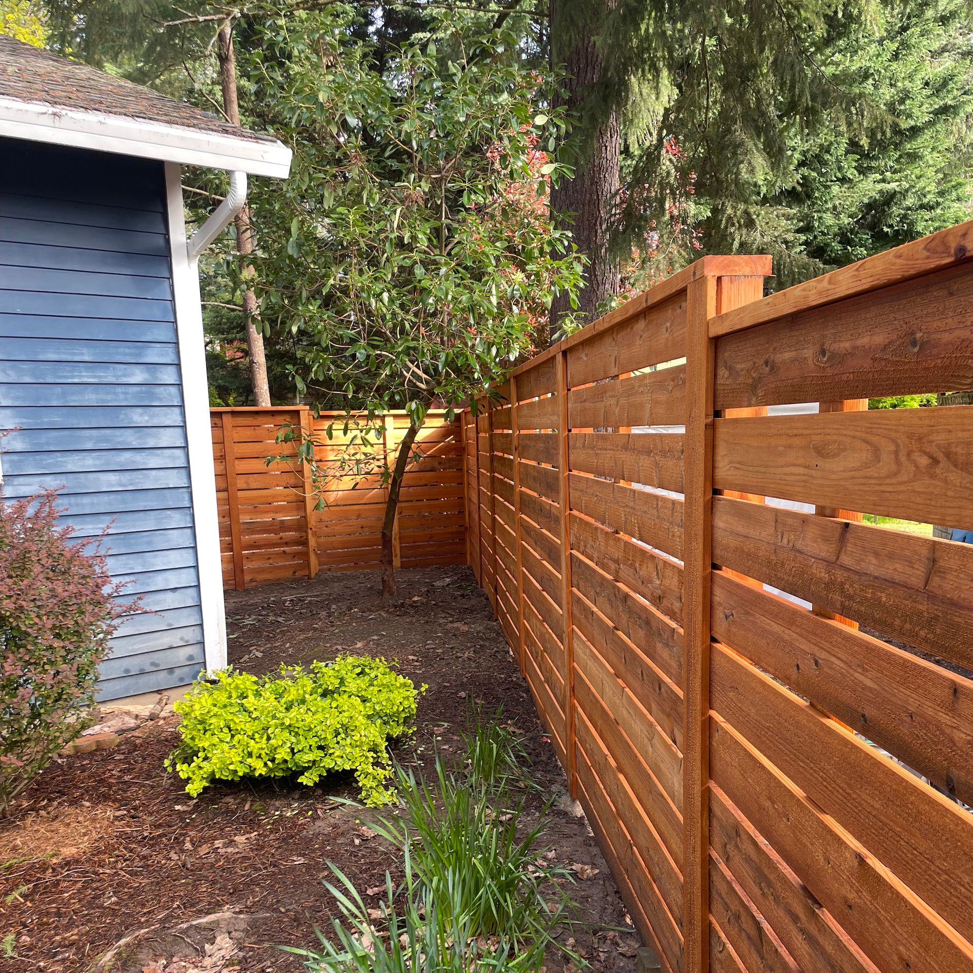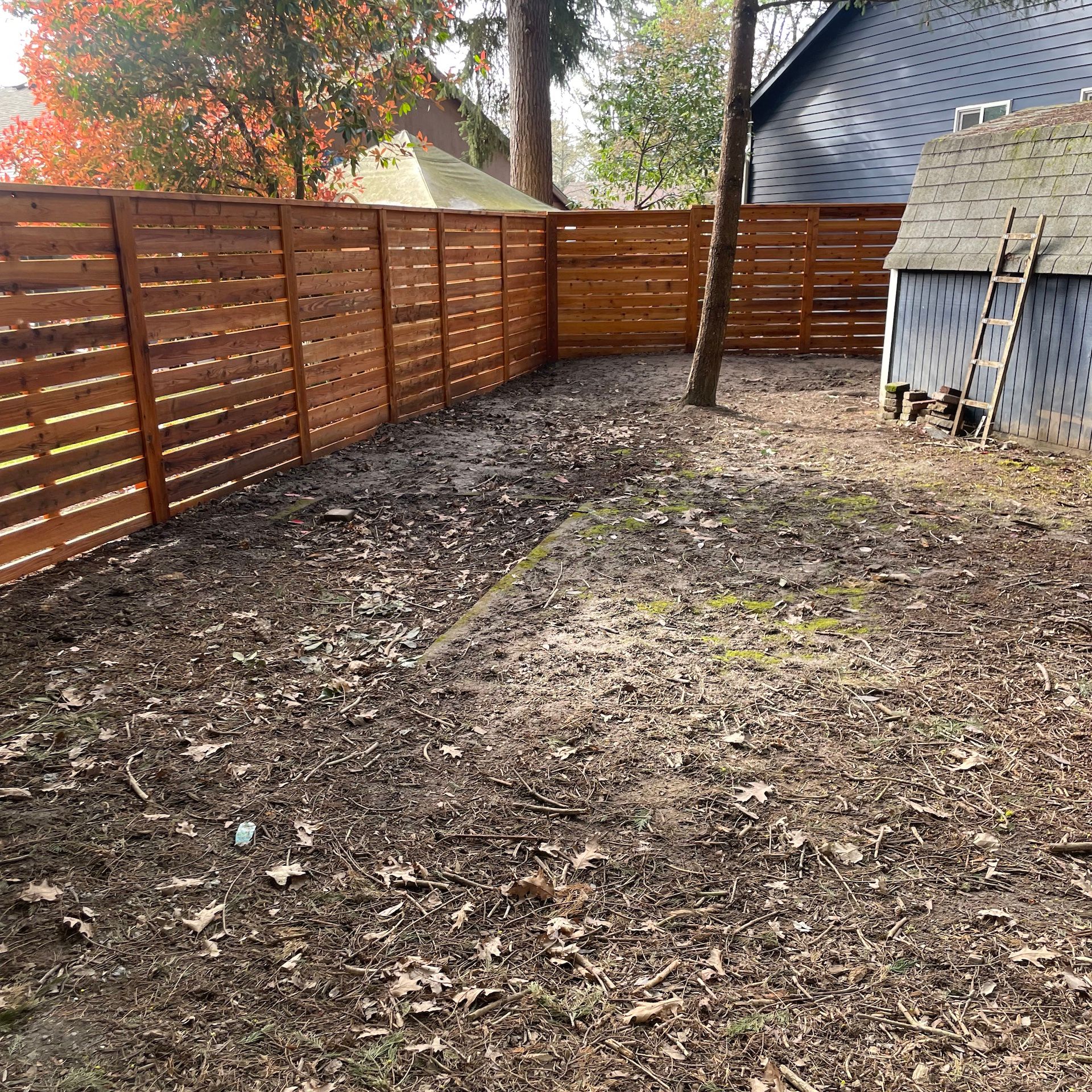 Give any backyard a new look with a wood board fence. This homeowner went with a medium orange stained wood fence to provide some style and privacy to the backyard. All our fencing material comes pre-treated to be weather resistant and can be stained to the color of your choice.